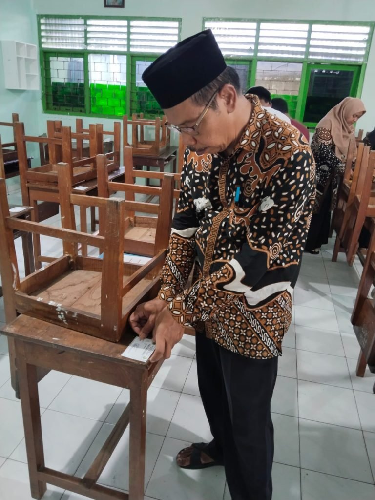 Jelang UMAD, Waka Sarpras MAN 2 Bantul Pimpin Pemasangan Nomor Ujian di Ruang Kelas