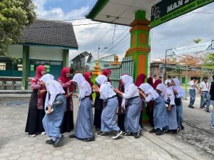 Bantul (MAN 2 Bantul) — Jajaran guru dan tenaga kependidikan Madrasah Aliyah Negeri (MAN) 2 Bantul tampak kompak dan penuh semangat menyambut kedatangan rombongan studi tiru dari SMAN 1 Susukan, Semarang. Momen penyambutan ini berlangsung di halaman depan madrasah, tepat di gerbang utama MAN 2 Bantul yang menjadi ikon selamat datang bagi para tamu.
