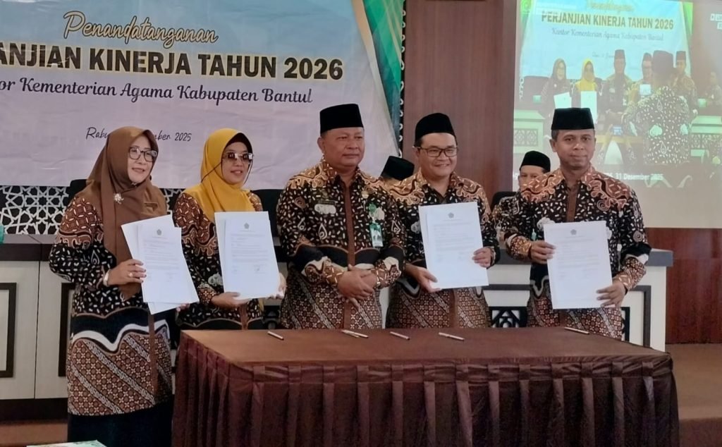 Kegiatan ini dihadiri langsung oleh Kepala Kantor Kementerian Agama Kab. Bantul, Muntolib, Kasubbag TU, Aminuddin, Kepala Seksi/Penyelenggara, Kepala KUA serta Kepala Madrasah MIN, MTsN dan MAN di Aula PLHUT. Penandatanganan perjanjian kinerja ini menjadi agenda penting dalam rangka penguatan komitmen pelaksanaan program dan peningkatan kualitas layanan pendidikan madrasah pada tahun 2026.