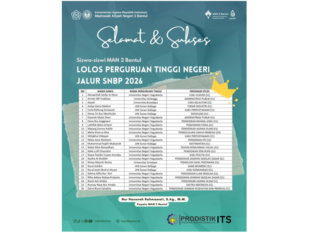 Bantul (MAN 2 Bantul) – Sebanyak 26 siswa dari MAN 2 Bantul berhasil lolos ke perguruan tinggi negeri melalui jalur Seleksi Nasional Berdasarkan Prestasi (SNBP). Pengumuman yang disampaikan pada Selasa, 31 Maret 2026 pukul 15.00 WIB ini disambut dengan penuh rasa syukur dan kebanggaan oleh seluruh warga madrasah. Keberhasilan tersebut menjadi bukti nyata kualitas akademik siswa sekaligus efektivitas pembinaan yang dilakukan secara berkelanjutan dalam mempersiapkan lulusan yang siap bersaing di tingkat nasional.