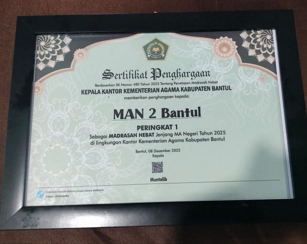 Bantul (MAN 2 Bantul) — Suasana penuh sukacita menyelimuti keluarga besar MAN 2 Bantul setelah madrasah ini resmi dinobatkan sebagai Juara 1 Madrasah Hebat Tahun 2025 berdasarkan Keputusan Kepala Kantor Kementerian Agama Kabupaten Bantul Nomor 480 Tahun 2025. Pengumuman yang dirilis pada Senin pagi itu disambut dengan rasa bangga yang membuncah, terutama oleh Kepala MAN 2 Bantul, Nur Hasanah Rahmawati, yang menyebut kemenangan ini sebagai “buah dari kerja kolektif yang konsisten, penuh ketekunan, dan berorientasi masa depan.”