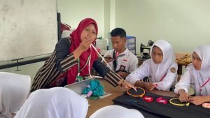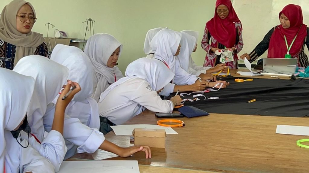 Kegiatan paling menarik terlihat saat berada di Laboratorium Tata Busana. Di sana, para siswa berkesempatan belajar langsung membuat sulaman pita. Praktik ini dipandu oleh guru Tata Busana, Murti Madiyanti dan Afiah Nur Aqini, yang dengan sabar membimbing setiap langkah pembuatan sulaman.