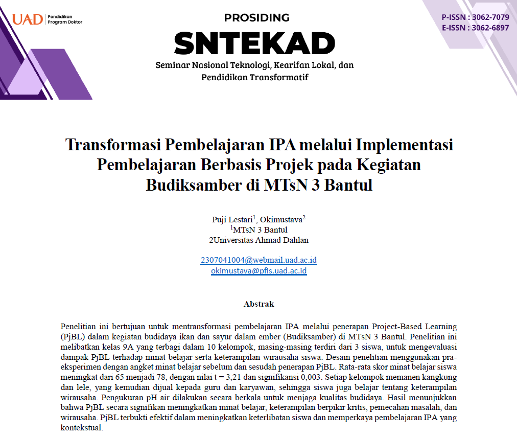 Penelitian ini bertujuan untuk mentransformasi pembelajaran IPA melalui penerapan Project-Based Learning (PjBL) dalam kegiatan budidaya ikan dan sayur dalam ember (Budiksamber) di MTsN 3 Bantul. Penelitian ini melibatkan kelas 9A yang terbagi dalam 10 kelompok, masing-masing terdiri dari 3 siswa, untuk mengevaluasi dampak PjBL terhadap minat belajar serta keterampilan wirausaha siswa. Desain penelitian menggunakan pra-eksperimen dengan angket minat belajar sebelum dan sesudah penerapan PjBL. Rata-rata skor minat belajar siswa meningkat dari 65 menjadi 78, dengan nilai t = 3,21 dan signifikansi 0,003. Setiap kelompok memanen kangkung dan lele, yang kemudian dijual kepada guru dan karyawan, sehingga siswa juga belajar tentang keterampilan wirausaha. Pengukuran pH air dilakukan secara berkala untuk menjaga kualitas budidaya. Hasil menunjukkan bahwa PjBL secara signifikan meningkatkan minat belajar, keterampilan berpikir kritis, pemecahan masalah, dan wirausaha. PjBL terbukti efektif dalam meningkatkan keterlibatan siswa dan memperkaya pembelajaran IPA yang kontekstual.
